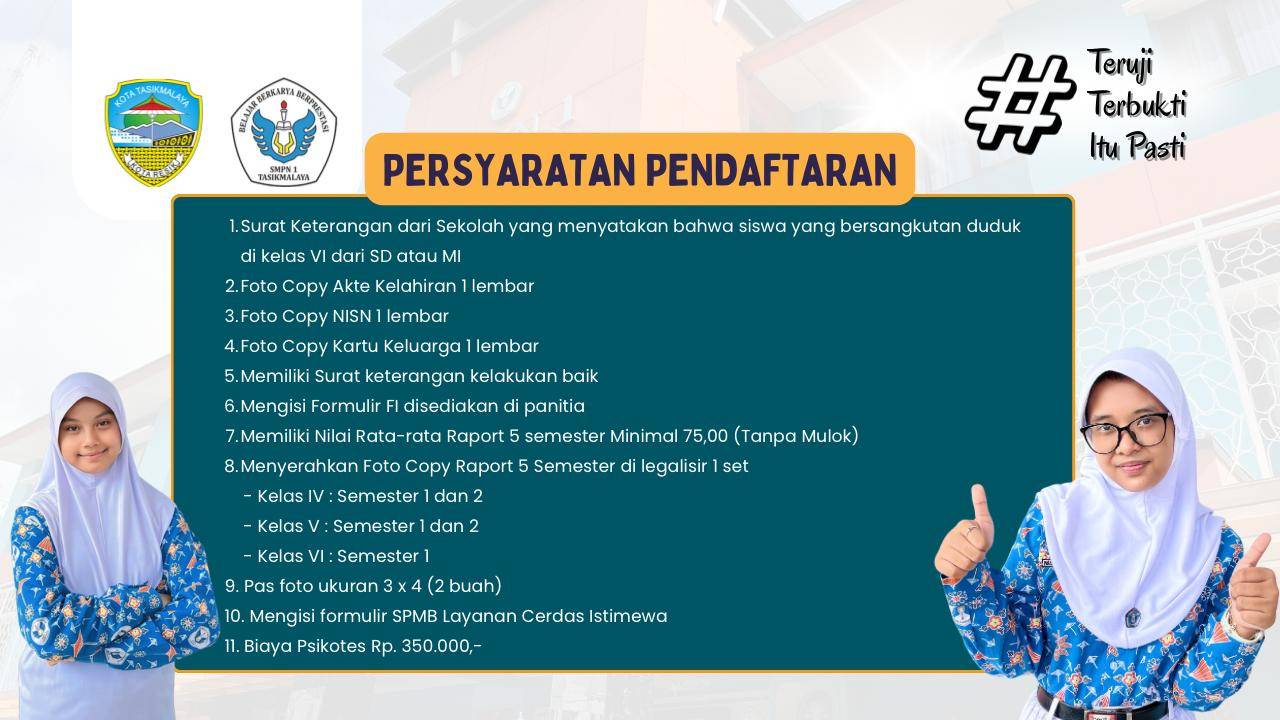 Pendaftaran dapat dilakukan secara kolektif oleh sekolah asal (SD/MI) maupun perorangan langsung ke kampus SMP Negeri 1 Tasikmalaya.